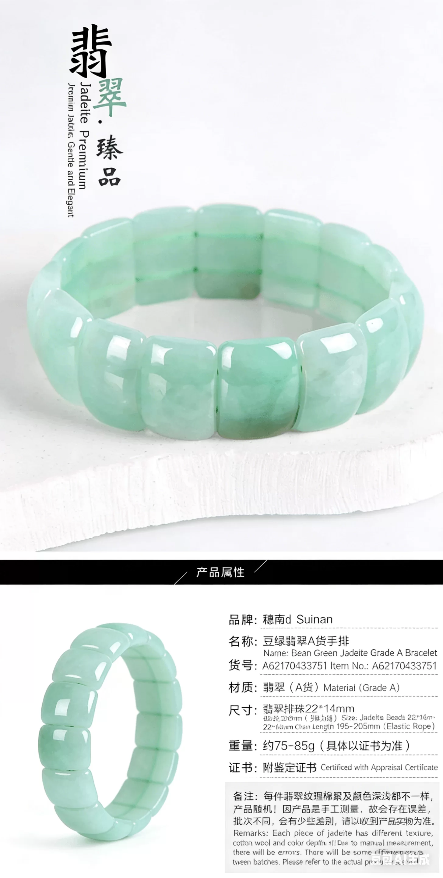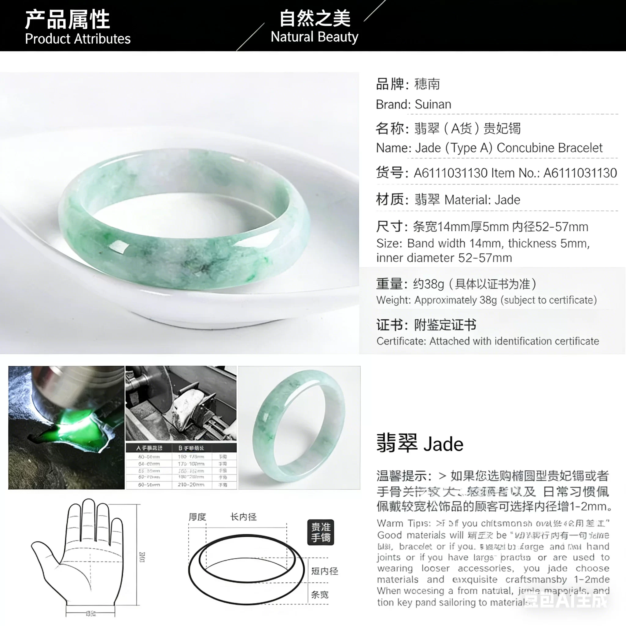 This natural A-grade jade bracelet exudes timeless elegance and outstanding value. With pure texture, lasting luster and profound cultural heritage, it not only enhances personal charm but also holds potential for appreciation. Whether for daily wear or collection, it combines luxury, health connotations and versatile style, making it suitable for consumers who pursue refinement and have a discerning eye.